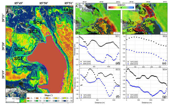 Topographic slope and glacier thickness change for four potential avalanche source zones. (a) The slope of the potential avalanche zones, named SC1, SC2, SC3 and SC4. (b) The glacier thickness changes in four potential zones during 1975–2000. (c). The glacier thickness changes in four potential zones during 2000–2016. Four dotted black lines represent four selected profiles on their potential avalanche zones. (d–g) The thickness changes in the four avalanche zones, respectively.