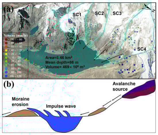 Schematic summarization of potential avalanche zones, lake size, and the GLOF process. (a) The deformation rates of four potential avalanche zones and the lake shore of Galong Co. The red lines represent the glacier boundary from the Randolph Glacier Inventory (RGI6.0). The cyan areas represent SC1-SC4, shown in Figure 7. (b) The avalanche’s movement into the lake, and related GLOF process chains that may happen in the future.