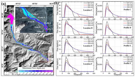 Figure 10a illustrates the maximum flow depth for the large-magnitude release volume (V1) using a breaching depth of 87 m (D1). Subsequently, we analyzed the GLOF routing flow depth and discharge at different positions in Nyalam under three scenarios, as shown in Figure 10b.