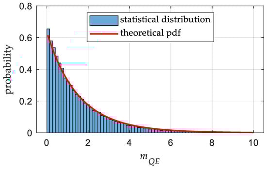 To validate the correctness of the probability analysis, we used the TEXBAT clean signal file “cleanStatic.bin”, which records the authentic signals received from the reference antenna. The test quantity was calculated during a tracking period of 60 s, and the statistical distribution is shown in Figure 2. It can be observed that the statistical result aligns well with the theoretical pdf curve of the detection statistic.