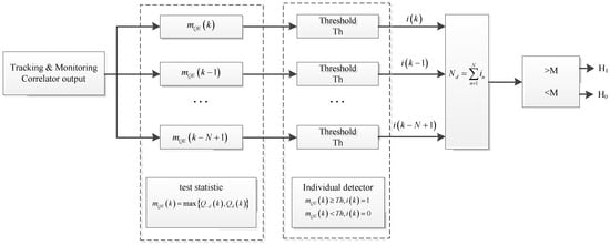 A detection strategy named as the M of N technique was adopted to optimize the detection performance, avoiding false alarms caused by noise fluctuations and platform dynamics, etc. This strategy is equivalent to a low-pass filtering process to the detection results at the expense of decision latency. The detection process is illustrated in Figure 4.
