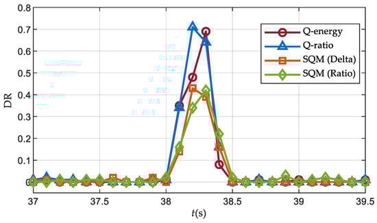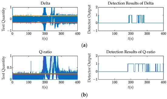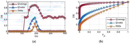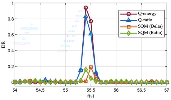 Compared with Figure 8, it is evident that the Q energy detector performs better in the overpowered scenario with a detection rate exceeding 0.8 for . Conversely, the Q ratio detector performs even worse, mainly due to the differences in normalization parameters between these two methods. The performance of the Delta metric remains relatively unchanged.