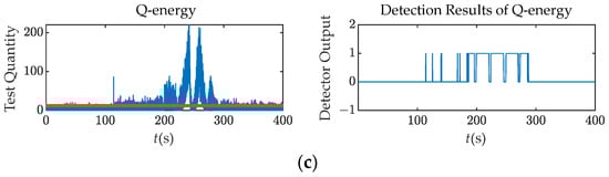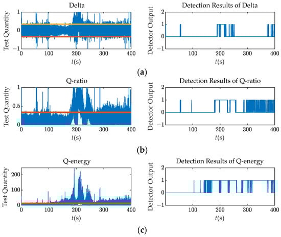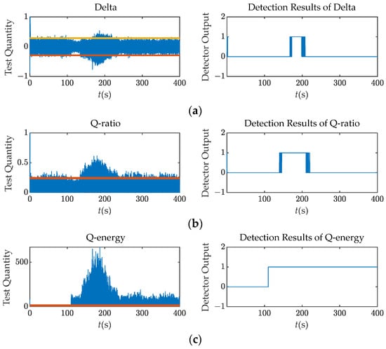 Test quantities and detection results (M = 15, N = 200) over Scenario 5: (a) Delta; (b) Q ratio; (c) Q energy.