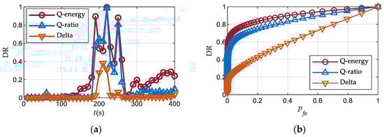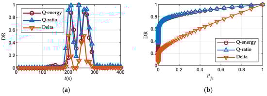 In order to further evaluate the detection performance of different detectors, Figure 18 shows the detection rates with a window length of L = 100 ms in Scenario 1. The implementation process and details main consistent with those presented in Section 5. As can be seen from Figure 18, it is evident that in the static power-matched detection scenario, the detectors based on the Q channel energy outperform the traditional SQM metrics.