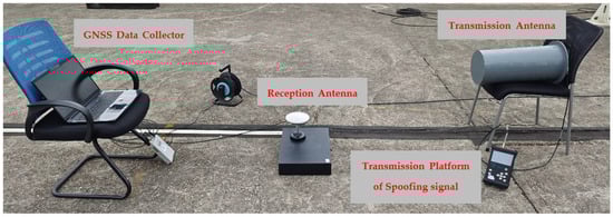 The test platform and scheme are shown in Figure 13 and Figure 14, respectively. The details of the equipment used in this experiment are shown in Table 6. In this experiment, IF samples were collected at a sampling rate of 25 MHz using a 2-bit quantizer. The spoofing signal was generated offline, requiring power calibration and parameter estimations beforehand. Therefore, we considered the PRN 3 signal transmitted by a geostationary satellite, as its change rate of the Doppler frequency is relatively small. In the initial 20 s of the experiment, no spoofing signal was transmitted to ensure that the receiver initially locks onto the authentic signal. It is worth noting that the focus of the preliminary experiment was on the drag-off process of the tracking loop. In order to clearly show that the loop was successfully pulled by the spoofing signal, we set all the data bits of the spoofing signal to 1. The data bits of the spoofing signal had little effect on the pull-off process. The spoofed velocity was 10 Hz in order to achieve the code-phase alignment in a relatively short time.