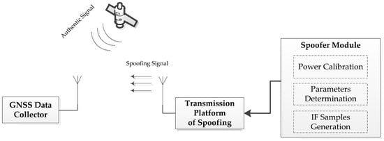 The complexity of spoofing designs is positively related to its approximation to the authentic signals. Spoofing designs can be divided into three categories: simplistic design, intermediate design and sophisticated design []. The simplistic design employs a GNSS signal source and a radio frequency front end. The simplistic spoofing signals can be re-captured by receivers after destroying the receiving link of the true signals with high power. This method is simple and effective but easy to be detected. The intermediate spoofing signal makes the tracking loop converge to it without destroying the loop state by precisely controlling its parameters, such as power and code phase [,]. The intermediate design has little effect on the received power and other characteristic quantities, making it less likely to be detected and more harmful to practical applications compared with the former design. The sophisticated design uses multiple intermediate spoofers to approximate the authentic signals in the spatial dimension. However, this design is difficult and costly to implement as it requires time synchronization and communication between spoofers []. Therefore, this paper focuses on the detection of the intermediate design due to its greatest threat.