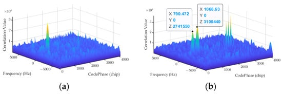 In the acquisition process, the local pseudocode was zero-padded with 1 ms to prevent data bit flip. The navigation message of the authentic signal was modulated with a 1 kbps secondary code. We only need to pay attention to the former code period in Figure 15. In this figure, two peaks can be observed in the correlation domain after the spoofing signal is transmitted. The new peak in Figure 15b, slightly higher than the original one, indicates that the spoofing signal is power-matched with the authentic signal.