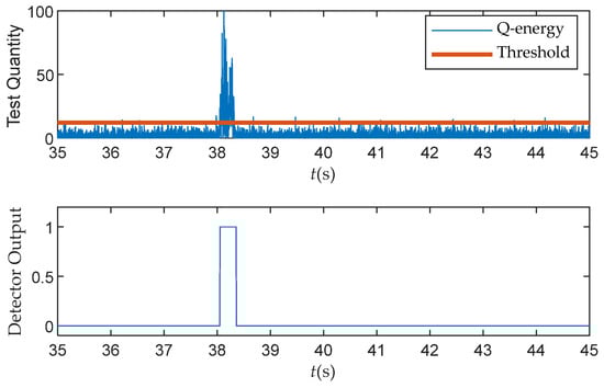 All these three scenarios in Table 4 belong to the Static Matched-Power Scenario with similar detection results. Taking Scenario 1 as an example, the effectiveness of the Q energy detector in the real world can be observed from Figure 17. This figure displays the outputs of the M of N detector and the proposed test quantities from 35 s to 45 s. Due to the high spoofed velocity of 10 Hz, the interval of correlator output fluctuation is short. Therefore, the N = 50 samples (or 0.05 s) and M = 5 samples were selected. The other configuration and process of this experiment are identical to those described in Section 5.