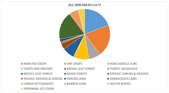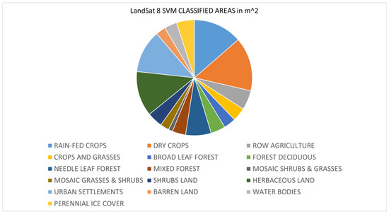 For the Landsat 8 image classification, accuracy reports were created, and a summary of the classification accuracy is reported in Table 3. Overall classification accuracy for support vector machines was found to be 82.5% and the kappa coefficient was 81.33%. For random forest, the decrease in accuracies can be observed due to the thematic error and the values are 64% for kappa and 66% for overall accuracy. In the case of the Sentinel 2 image (Table 4), the accuracies were high for the random forest algorithm with a value of 78% for overall accuracy and kappa coefficient. A comparison was made between the land-use areas of global land cover 2009 and 2019 Landsat 8 classified image with the greatest accuracy achieved from the classification methods considered in this research. The area showed the highest rate in terms of urbanization with a value of 4232.9 km2 as compared to the urban area calculated by global land cover in 2009 which was 14. km2. Despite achieving high classification accuracy, the support vector machines exhibited some misclassification, particularly in urban areas, suggesting potential confusion between urban pixels and other classes, leading to potentially erroneous results. The remaining classes did not depict this difference and the values for these classes were acceptable. Larger areas include ranges, forests, and agriculture with the values of 7215.6 km2, 6443.5 km2 and 13,333.1 km2, which are lesser than the areas of global land cover in 2009. Most classes showed a decreasing trend, but settlements skyrocketed during the 10 years between 2009 and 2019 (Figure 3).