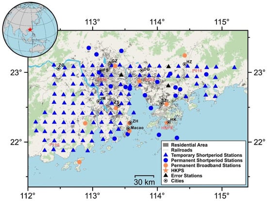 Locations of seismic stations in the GBA. The map displays the 138 seismic stations in this study. The red star in the inset represents the location of the study area. Blue triangles and circles denote the short-period seismometers; Orange circles denote broadband seismometers; Black triangles represent faulty stations. Temporary stations, Guangdong permanent stations, and Hong Kong station are denoted by triangles, circles, and pentagons, respectively. The locations of cities are labeled with Guangzhou (GZ), Shenzhen (SZ), Zhuhai (ZH), Foshan (FS), Huizhou (HZ), Dongguan (DG), Zhongshan (ZS), Jiangmen (JM), Zhaoqing (ZQ), and Hong Kong (HK) labeled. Dark gray areas indicate residential areas, and solid gray lines indicate major railroads. The labeled stations are discussed in detail in this study, with P025 and P030 situated in urban areas and P016 and P100 in rural areas.
