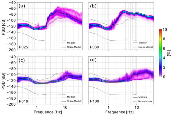 Probability density function (PDF) analysis for the vertical components of different stations. We analyzed data from November 2019 to 24 January 2020 (before the COVID-19 pandemic outbreak). The black solid line represents the median PSD, and the two gray dashed lines represent the high-noise model and low-noise model (NHNM, NLNM) proposed by Peterson []. (a–d) correspond to stations P025, P030, P016 and P100, respectively, with P025 and P030 situated in urban areas and P016 and P100 situated in rural areas.