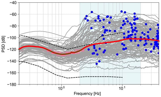 Median PSDs of vertical components for all the stations. We analyzed data from November 2019 to 24 January 2020 (before the COVID-19 pandemic outbreak). Each solid gray line in the figure represents the median PSD of an individual station. The blue circle denotes the peak frequency of cultural seismic noise greater than 1 Hz for each station. The red solid line represents the average curve of the median PSDs of all the stations. The two gray dashed lines in the figure are the high-noise model and low-noise model (NHNM, NLNM) proposed by Peterson (1993) [].