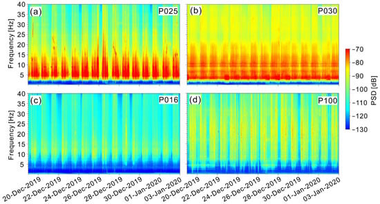 The vertical component spectrums of the stations are located in different environments. We used data from 19 December 2019 to 3 January 2020 (before the COVID-19 pandemic outbreak). (a–d) correspond to stations P025, P030, P016, and P100, respectively, with P025 and P030 situated in urban areas and P016 and P100 situated in rural areas.