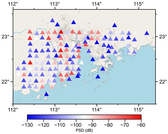 Previous studies have shown that cultural seismic noise changes significantly during traditional festivals such as the Chinese Spring Festival [,], Christmas [,], and others. In our dataset, 120 stations recorded cultural seismic noise during the New Year’s Days, a three-day holiday for Chinese citizens. Due to factory closures and school vacations, cultural seismic noise levels on New Year’s Day were considerably lower than usual (Figure 7b and Figure 10). To investigate the variations in cultural seismic noise within the GBA on New Year’s Day, we computed the average noise levels at each station during this period. The results showed that 77% of the stations experienced a reduction in noise levels (Figure 9c). The average noise level in the GBA decreased by approximately 8.1% on New Year’s Day, indicating a more substantial reduction and broader impact than those observed on weekends (Figure 9b,c).