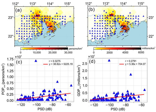(a) Spatial distribution of population density in the Guangdong–Hong Kong–Macao Greater Bay Area. (b) Same as (a), but for the gross domestic product (GDP). (c) Average cultural seismic noise in 2–20 Hz of each station, with the average population density within 10 km around each station. (d) Same as (c), but with the average GDP within 10 km around each station. We analyzed data from November 2019 to 24 January 2020 (before the COVID-19 pandemic outbreak). The red solid lines in the figures represent the results of the line fitting of cultural seismic noise with population and GDP, respectively, and r indicates their correlation coefficients.