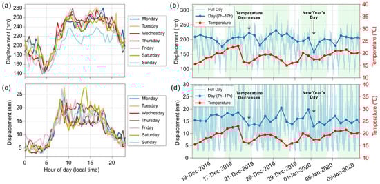 (a) Hour-wise variation of cultural seismic noise at P030. (c) Same as (a), but representing P100. We analyzed data from November 2019 to 24 January 2020 (before the COVID-19 pandemic outbreak). (b) Daily variation of P030 cultural seismic noise and local air temperature over time. (d) Same as (b) but representing P100. P030 and P100 are located in the urban area and rural area, respectively. Noise levels are expressed in terms of ground displacement. A light green background signifies weekdays, while a white background denotes weekends. All times are presented in local time.
