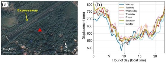 (a) Location of P003. There is an expressway approximately 80 m to the northwest. The red triangle indicates station location. The yellow arrow points to an expressway. (b) Hour-wise variation in cultural seismic noise at P030. We analyzed data from November 2019 to 24 January 2020 (before the COVID-19 pandemic outbreak). It can be seen that the noise level is significantly greater at night than during the day. Noise levels are expressed in terms of ground displacement. All times are presented in local time.