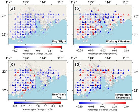 Spatial distribution of cultural seismic noise in the GBA at different periods. The percentage of cultural seismic noise change is calculated based on ground displacement changes. (a) Changes in cultural seismic noise at nighttime (0 a.m.–5 a.m.) compared to daytime (7 a.m.–5 p.m.) with 135 stations available. Blue indicates a decrease in noise level at night. (b) Changes in cultural seismic noise on weekends compared to weekdays, with 135 stations available. Blue indicates a decrease in noise level during the weekends. (c) Changes in cultural seismic noise during New Year’s Day compared to weekdays, with 120 stations available. Blue indicates a decrease in noise level during New Year’s Day. (d) Changes in cultural seismic noise during the temperature decrease (18–23 December 2019) compared to the weekends, with 122 stations available. Blue indicates a decrease in noise level during the temperature decrease.