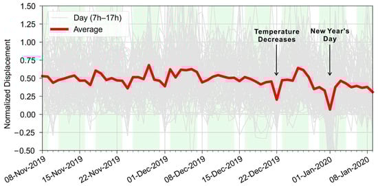 Changes in cultural seismic noise at all the stations in the GBA before the COVID-19 pandemic outbreak. Each solid gray line represents the change in cultural seismic noise at a station during the daytime hours (7 a.m.–5 p.m.). The thick red line indicates the average of all the stations. Cultural seismic noise level expressed as normalized ground displacement. The light green background denotes weekdays, while a white background indicates weekends.