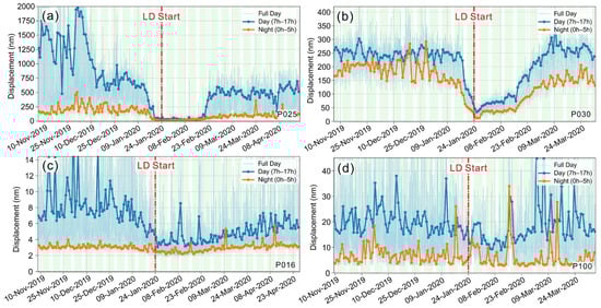 The variation of cultural seismic noise at stations in different environments before and after lockdown. (a–d) represent stations P025, P030, P016 and P100, respectively, with P025 and P030 situated in urban areas, and P016 and P100 in rural regions. Cultural seismic noise levels are expressed as ground displacement. The light blue solid line represents the daily cultural seismic noise change, and the blue solid line indicates the daytime (7 a.m.–5 p.m.) cultural seismic noise variation. The orange solid line denotes the nighttime (0 a.m.–5 a.m.) cultural seismic noise variation. The red dot–dash line indicates the start of the lockdown on 24 January 2020. The label “LD Start” means “Lockdown Start”.
