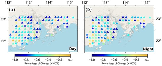 Spatial distribution of cultural seismic noise changes at each station in the GBA after the lockdown. (a) displays the change in cultural seismic noise during the daytime (7 a.m.–5 p.m.) after the lockdown. A darker blue indicates a greater decrease in cultural seismic noise. (b) is the same as (a) but represents the change of cultural seismic noise at nighttime (0 a.m.–5 a.m.) after the lockdown.