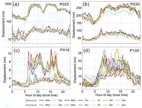 Hour-wise variation of cultural seismic noise at stations in different environments before and after lockdown. (a–d) represent stations P025, P030, P016 and P100, respectively, in which P025 and P030 are located in urban areas and P016 and P100 are located in rural areas. The cultural seismic noise levels are expressed as ground displacement.