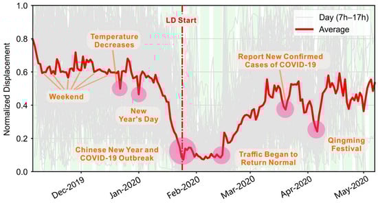 The variation of cultural seismic noise at all the stations in the GBA before and after the COVID-19 pandemic outbreak. Each gray solid line represents the change in cultural seismic noise at a station during the daytime hours (7 a.m.–5 p.m.). The solid red line represents the average of all the stations. Cultural seismic noise levels are expressed as normalized ground displacement. The light green background denotes weekdays, and the white background represents weekends. The red dot-dash line marks the initiation of the lockdown on 24 January 2020. The label “LD Start” means “Lockdown Start”. The orange label explains the reason for the change in corresponding cultural seismic noise.
