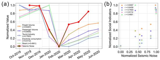 (a) Comparisons between cultural seismic noise and social statistical data in the GBA. The Social statistical data include freight volume, passenger volume, electricity consumption, tourism and retail trade. (b) Scatter plot illustrating the correlation between cultural seismic noise and social statistical data in (a), with r denoting the correlation coefficient. All data utilized for plotting are normalized.