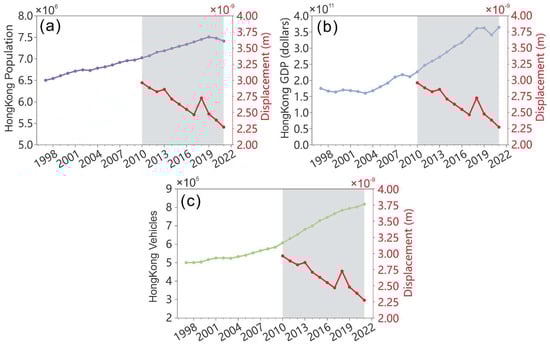 Over the past few decades, the global economy and population have experienced continuous growth, and cultural seismic noise has also changed. In this study, we used 12-year-long seismic data from the Hong Kong seismic station (HKPS) to analyze the relationship between long-term cultural seismic noise changes and social development in Hong Kong. The HKPS seismic station is located in the Central and Western District of Hong Kong, which has a population of approximately 240,000 people and is among the first areas to be developed in Hong Kong. Here, we analyzed the daytime (7 a.m.–5 p.m.) cultural seismic noise between 2 and 20 Hz at this station. The results showed a decreasing trend in cultural seismic noise over the 12 years, with a 23% decrease compared to the noise levels measured in 2010 (Figure 17a,b). Concurrently, when comparing the changes in population and traffic flow in Hong Kong’s Central and Western District from 2010 to 2021, it was observed that the local population declined by 9%, and road traffic declined by 22.3% over the past 12 years (Figure 17a,b). Correlation analysis revealed that the correlation coefficients between cultural seismic noise and population, as well as road traffic in the Central and Western District, were 0.9441 and 0.8966, respectively, and the linear relationships were depicted in the graphs (Figure 17d,c). Interestingly, when comparing the changes in population, GDP, and vehicles for the entire Hong Kong region, the results were the opposite. Over the past 12 years, the population, GDP, and vehicles in Hong Kong increased by 5.5%, 61.1%, and 34.6%, respectively (Figure 18). These results show a completely different trend from the variation in cultural seismic noise, indicating that long-term analysis of cultural seismic noise can be another potential way of understanding local social development.