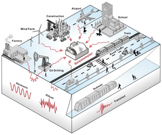 Since the early era of seismic instrumentation, it became clear that seismometers were capable of recording a wide variety of natural and human-made phenomena []. In the second half of the 19th century, seismologists established the link between meteorology and ambient seismic noise []. As reported by Díaz [], Wiechert proposed that low-frequency ambient seismic noise was mainly generated by coastal waves in 1904 [], and Zoeppritz linked ambient seismic noise to moving offshore storm systems in 1908 []. In order to know the characteristics of ambient seismic noise, numerous theoretical and experimental studies have been conducted on the components and generation mechanisms of ambient seismic noise. Based on different generation mechanisms, ambient seismic noise can be classified into three main types: (1) self-noise, which is generated by seismometers and their recording systems []; (2) natural seismic noise, which originates from natural environmental changes such as ocean waves [], wind [], and air pressure [], and is mostly a low-frequency signal below 1 Hz; (3) cultural seismic noise, which is generated by human activities such as recreational activities [], transportation [], and industrial production [], and typically comprises high-frequency signals greater than 1 Hz.