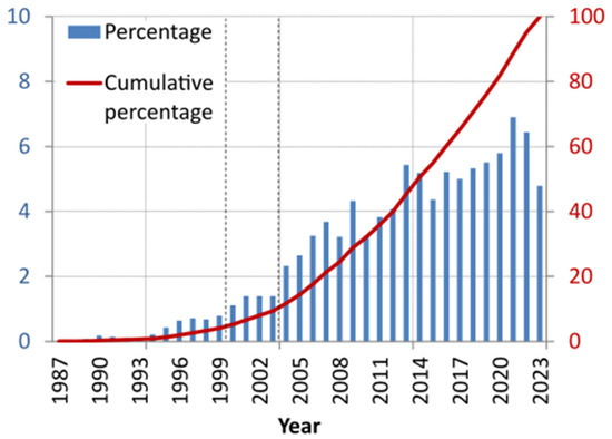 Percentage of GNSS CORS publications (blue bars, primary y-axis) and cumulative percentage (red line, secondary y-axis) from 1987.