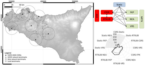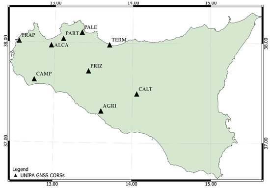 With an area of 25,711 km², Sicily (Italy, Europe) is the largest island in the Mediterranean Sea and occupies a strategic position that has made it, over the centuries, a centre of attraction and a crossroads of people and artistic, cultural, and scientific traditions. Until the last decade, the presence of GNSS CORS was limited exclusively to deformation monitoring and strain control activities. Two main CORS networks managed by the INGV (Istituto Nazionale di Geofisica e Vulcanologia, Italian National Institute of Geophysics and Volcanology) and the Italian Institute for Environmental Protection and Research (Istituto Superiore per la Protezione e la Ricerca Ambientale, ISPRA) have been implemented in the last decades.