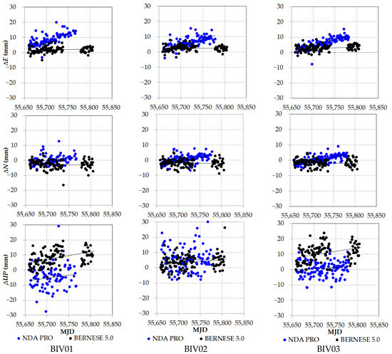 The shift with time of ∆E, ∆N, and ∆UP solutions is estimated via Bernese 5.0 and NDA (blue and black dots, respectively) at the receivers’ positions BIV01, BIV02, and BIV03. Adapted from [111].