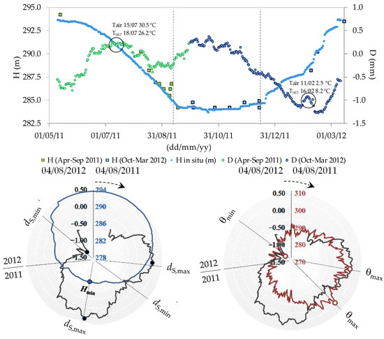 On the top panel: in situ water levels (light blue, primary axis), with superimposed levels estimated from remote sensing during the emptying and filling periods (green and blue circles, respectively), and GNSS-measured displacements (dark blue, secondary axis). On the lower panels: GNSS displacements (ds, black curve) versus in situ water levels (H, blue curve in the left panel) and versus air temperature (θ, red curve in the right panel).