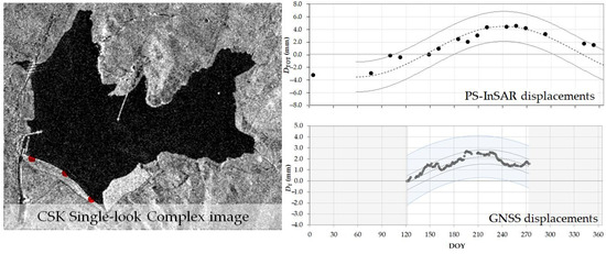 The behaviour of the displacements with water levels and temperature has led a few years later to further research; in [113] quasi-PS (Persistent Scatter) Interferometric SAR, diachronic thermal analysis and optical-based classification techniques were employed to assess both forcing factors and resulting displacements at the top of the dam over one year. Again, beyond Earth Observation images, including Sentinel-1A interferometric images and Landsat 8 thermal images, the GNSS data were essential to proving the concept. Indeed, the results revealed that it is possible to monitor both temperature-periodic forcing factors and the water levels of the dam and the resulting displacements through the combined use of different remotely sensed data (Figure 6).