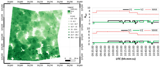 On the left panel: a pseudo-coloured canopy height model with over-imposed trees’ heights represented with the same white-green palette. On the right panel, the number of GLONASS and GPS satellites, V1 and V2, are represented with black lines and green lines, respectively. The maximum number of satellites is represented by a dashed red line. Adapted from [121].