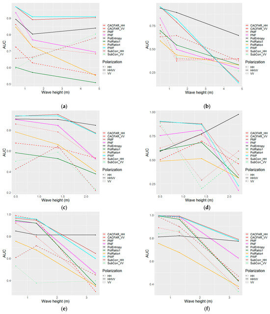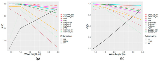 Comparison of the detector AUCs for different wave heights for HH VV. (a) Wind: cross, incidence angle: low and boat orientation: 45°. (b) Wind: cross, incidence angle: low and boat orientation: 90°. (c) Wind: up/down, incidence angle: low and boat orientation: 45°. (d) Wind: up/down, incidence angle: low and boat orientation: 90°. (e) Wind: up/down, incidence angle: medium and boat orientation: 45°. (f) Wind: up/down, incidence angle: medium and boat orientation: 90°. (g) Wind: up/down, incidence angle: high and boat orientation: 45°. (h) Wind: up/down, incidence angle: high and boat orientation: 90°.