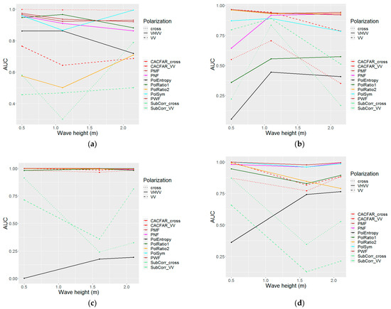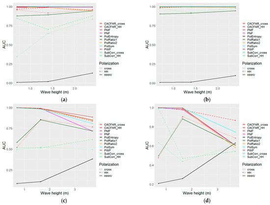 Comparison of the detector AUCs for different wave heights for VH VV. (a) Wind: up/down, incidence angle: medium and boat orientation: 45°. (b) Wind: up/down, incidence angle: medium and boat orientation: 90°. (c) Wind: up/down, incidence angle: high and boat orientation: 45°. (d) Wind: up/down, incidence angle: high and boat orientation: 90°.