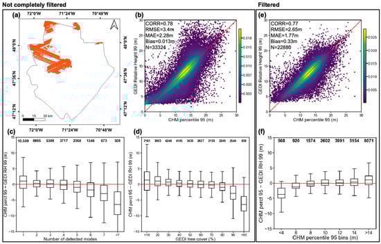 For the GEDI data with only the quality and degrade flags filtering: (a) location of the 2019 GEDI footprints overlapping the CHM for the year 2019 included in the analysis; (b) correspondence of GEDI RH 99 and CHM percentile 95 with the colors indicating the density of points in the scatterplot, 1:1 line in red for reference; (c) error distribution of the GEDI data in relation to number of detected modes; (d) error distribution of the GEDI data in relation to the GEDI tree cover. For the GEDI data with the complete filtering: (e) correspondence of GEDI RH 99 and CHM percentile 95 with the colors indicating the density of points in the scatterplot, 1:1 line in red for reference; (f) error distribution of the GEDI data in relation to the CHM percentile 95. Number of footprints per-bin are labeled at the top of the boxplots and mean value marked as a black line inside the boxes.