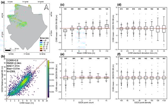 (a) Location of the forest stands with overlapping CHM and GEDI data for the year 2019 included in the analysis; (b) correspondence of GEDI RH 88 and mean CHM aggregated at the forest stand level with the colors indicating the density of points in the scatterplot, 1:1 line in red for reference. Error distribution according to the following: (c) bins of mean CHM; (d) CHM standard deviation; (e) GEDI point count; (f) GEDI point density. The number of polygons per bin are labeled at the top of the boxplots, the mean value is marked as a black line inside the boxes, and outliers shown as hollow circles.