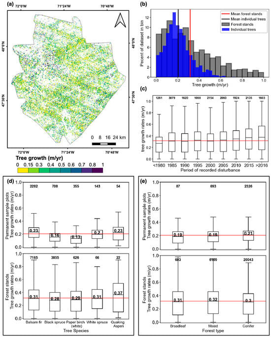 Tree-growth estimates for forest stands with values between 0 and 1 m/year: (a) spatial distribution of the tree-growth estimates; (b) histogram of estimated tree-growth rates for the forest stands and the individual trees from permanent sample plots; (c) distribution of the tree-growth rates according to the year of disturbance, with the mean value marked as a black line inside the boxes, the number of polygons per bin labeled at the top of the boxplots, and the global mean of the dataset shown as a horizontal red line. Analysis of tree-growth rates for the individual trees from permanent sample plots and forest stands per: (d) species and dominant species, respectively, and (e) forest type. The mean value of each group is labeled and marked inside the boxes with a black line, the number of individual trees or forest stands is labeled at the top of the boxplot, and the global mean of each dataset is shown as a horizontal red line.