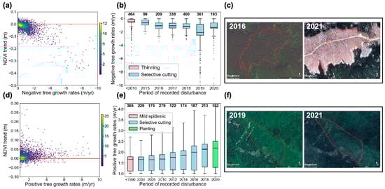 Results for polygons with negative (below 0 m/year) and positive (over 1 m/year) tree-growth rates matching trends in NDVI: (a,d) plots of NDVI trend against the estimated negative and positive tree-growth rate, respectively, with the colors indicating the density of points in the scatterplot; (b,e) distribution of the negative and positive tree-growth rates according to the year of the recorded disturbance, with the most common type of disturbance labeled by color, the mean value marked as a black line inside the boxes, and the number of polygons per bin labeled at the top; (c) before and after of a forest stand with a tree-growth rate of −2.3 m/year calculated between 2015 and 2019, that has a reported disturbance in 2018; (f) before and after of a forest stand with a tree-growth rate of 2.3 m/year calculated between 2019 and 2020 with no visible change in tree canopy cover.