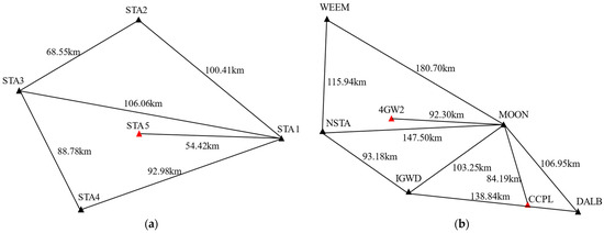 The experimental data used were CORS station data in western China from 27 May 2020 (DOY 148) and the AUSCORS station data from 9 February 2022 (DOY 40), with a sampling interval of 30 s. For the western-China CORS stations, five stations (STA1, STA2, STA3, STA4, and STA5) were selected. STA1 was chosen as the central reference station, and STA5 was used as the simulated rover station. For the AUSCORS stations, seven stations (MOON, DALB, IGWD, NSTA, CCPL, WEEM, and 4GW2) were selected. MOON was chosen as the central reference station, and CCPL and 4GW2 were used as the simulated rover stations, forming the basic solving unit of the star network.
