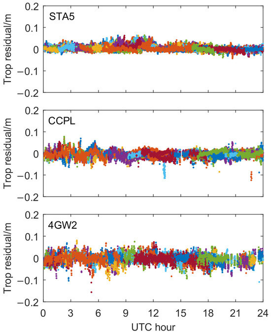 In Figure 2, the middle panel displays the tropospheric delay modeling residuals for the CCPL station, while the bottom panel depicts those for the 4GW2 station in the AUSCORS data. Most of the time, the tropospheric delay modeling residuals are small, with only a few satellites showing residuals exceeding half of the wavelength. Overall, the impact on the RTK positioning is minimal.