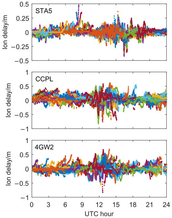 In NRTK technology, atmospheric delays between baselines are typically computed using geometric free (GF) or ionospheric free (IF) models. These errors are then modeled by linear or non-linear interpolation models over a region to estimate the atmospheric delay at the user’s position. Commonly used models include the Linear Interpolation Model (LIM), the Low-Order Surface Fitting Model (LSM), the Distance-Related Linear Interpolation Model (DIM), and the Linear Combination Model (LCM). These methods heavily rely on the spatial correlation of atmospheric delay and usually perform well when the atmospheric delay is relatively stable. According to research in recent years, tropospheric delay has significant correlations with height differences, elevation angles, baseline distances, and change slowly over time [8,9]. It has good spatial correlations and can be effectively addressed [10,11]. Meanwhile, ionospheric delay exhibits correlations with latitude, solar activity, and seasons [12,13,14]. This variability is more intricate, carries higher uncertainty, and lacks high-precision empirical models. Particularly, in cases involving long baselines and active ionospheric conditions (e.g., ionospheric scintillation, jitter, or medium-scale traveling disturbances), the above modeling methods are usually difficult to handle well. Ionospheric delay modeling residuals can significantly affect RTK positioning [15,16,17,18].