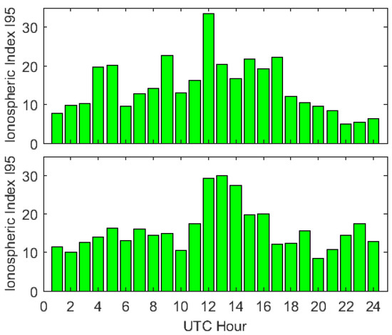 Ionospheric index I95 for different simulated rover stations: STA5 (top), CCPL and 4GW2 (bottom).