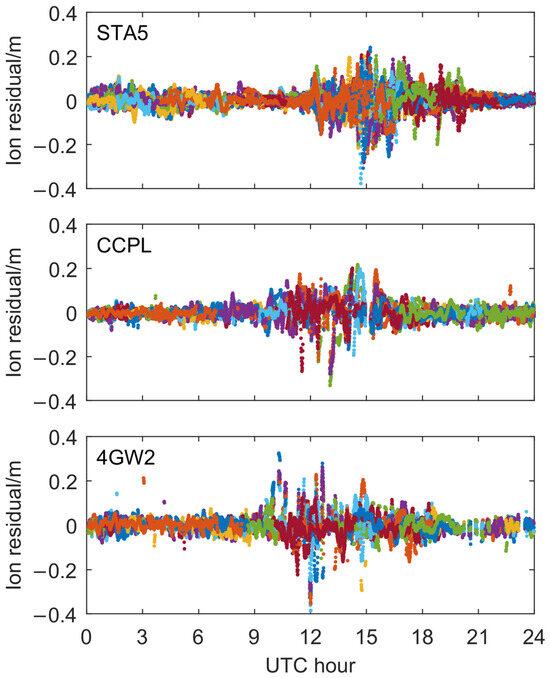 In Figure 3, the top panel illustrates the ionospheric delay for the STA5 station obtained from the NRTK baseline solution. In GPS, the ionospheric delay refers to the L1 frequency, while in BDS-2 and BDS-3, the ionospheric delay refers to the B1I frequency, and in GAL, the ionospheric delay refers to the E1 frequency. In Figure 4, the top panel displays the associated ionospheric index I95. It is evident that ionospheric disturbances occur from 12:00 to 18:00 in UTC, and the I95 index exceeds 10 or even approaches 20. Even though the baseline of the network used in this article is longer and the I95 index is relatively larger, overall, the I95 index still clearly shows ionospheric activity during this period, and more than half of the wavelengths are exceeded in the ionospheric delay during this period. The ionospheric delay modeling residuals for the STA5 station are presented in the top panel in Figure 5. These residuals are obtained by subtracting the ionospheric delay corrections from the virtual reference station from the simulated rover station (STA5)’s ionospheric delay. From the top panels of Figure 3 and Figure 5, it can be observed that the ionospheric delay is well-modeled during relatively quiet ionospheric periods, and the ionospheric delay modeling residuals are relatively small. However, during active ionospheric periods, the ionospheric delay modeling residuals become significant, which impacts the AR.