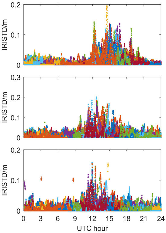 In Figure 6, the IRISTD for the STA5 station is presented in the top panel, while the IRISTDs for the CCPL station and the 4GW2 station are illustrated in the middle and bottom panels, respectively. By comparing Figure 5 and Figure 6, it can be observed that the IRISTD effectively characterizes the fluctuation in ionospheric delay modeling residuals. When the ionospheric delay modeling residuals increase, the IRISTD also increases, indicating that the latter contains relevant prior information related to ionospheric delay modeling residuals. Therefore, the IRISTD can serve as an indicator for describing ionospheric delay modeling residuals.