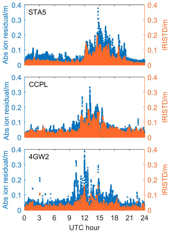 The comparison between the absolute value of the ionospheric delay modeling residuals and the IRISTD for different simulated rover stations: STA5 (top), CCPL (middle), 4GW2 (bottom).