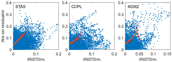To improve the capability of the IRISTD provided by the virtual reference station to describe the magnitude of ionospheric delay modeling residuals, a linear function, , is used to amplify the IRISTD. The stochastic model is fitted using the ionospheric delay modeling residuals’ absolute values and the IRISTD. First, in the ionospheric delay modeling residual sequence, which is represented by blue points in Figure 8, each ionospheric delay modeling residual has its corresponding IRISTD value. Next, we sort the IRISTD values and group them according to a step size of 0.001 m. There are several ionospheric delay modeling residuals in each group. We sort the ionospheric delay modeling residuals in each group and take the 95th % ionospheric delay modeling residual as the sample value, which is represented by red points in Figure 8. Then, we fit these sample values and obtain a stochastic model (yellow line). The left panel of Figure 8 illustrates a fitting graph of the absolute values of ionospheric delay modeling residuals for the STA5 station and the IRISTD of the virtual reference station. The stochastic model for the STA5 station is given by , and the value of b is non-zero. The non-zero value of b is mainly due to the presence of noise in the original carrier observation values. For example, when the noise in the carrier observation values is 0.5 cm, it will result in a noise of about 1 cm in the double-difference ionospheric delay calculated by the geometry-free model. Furthermore, when using the double-difference ionospheric delay for atmospheric error modeling, this noise is further amplified, resulting in a basic noise that is commonly present in the atmospheric error modeling values.